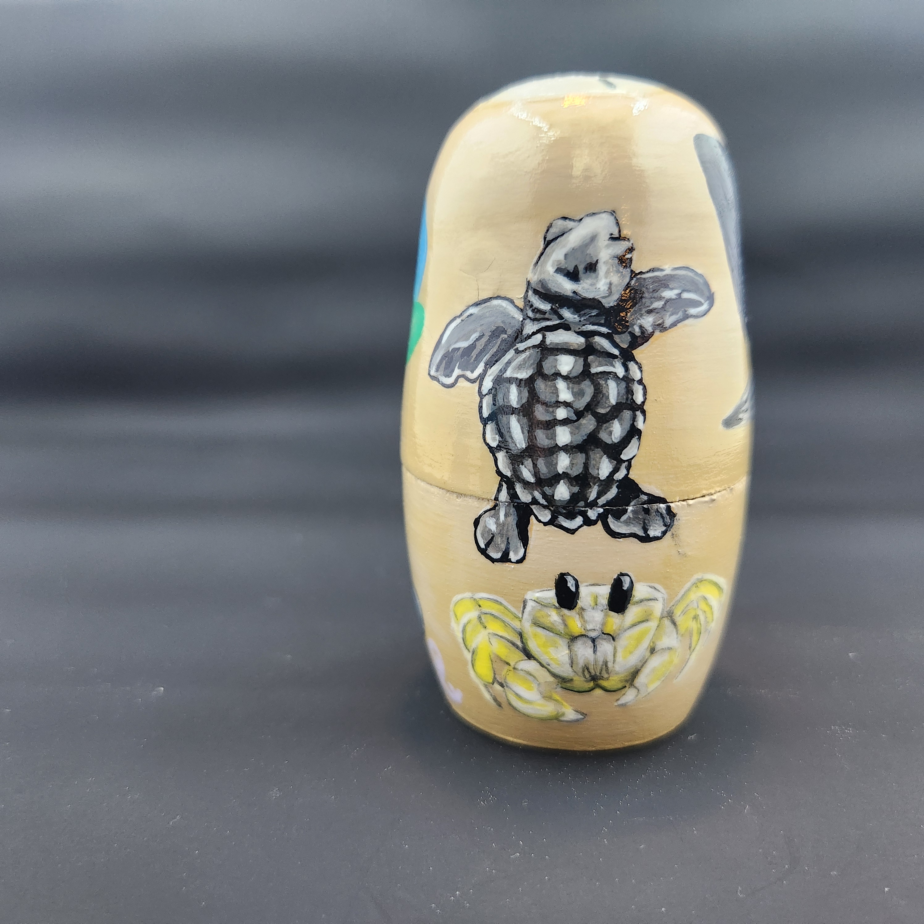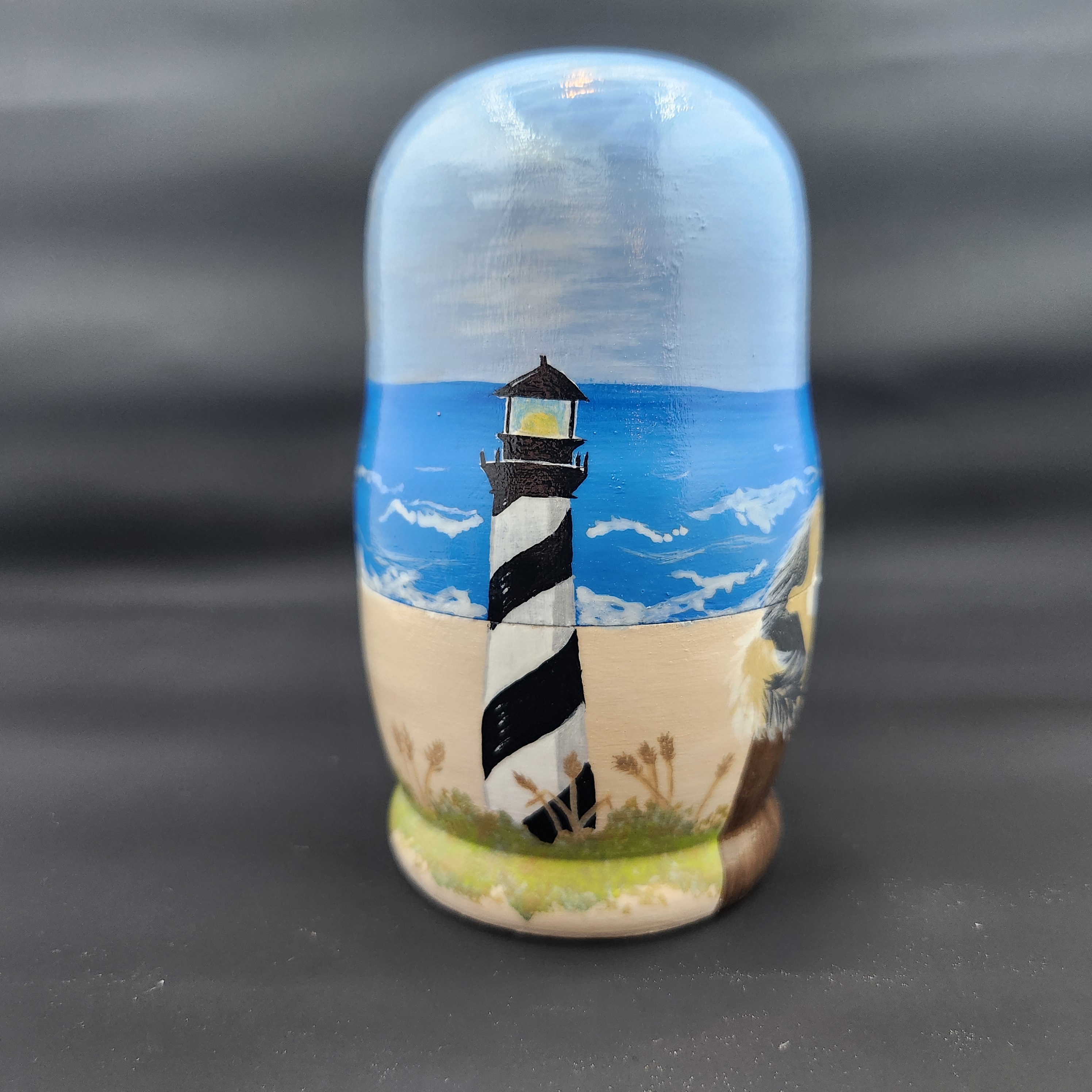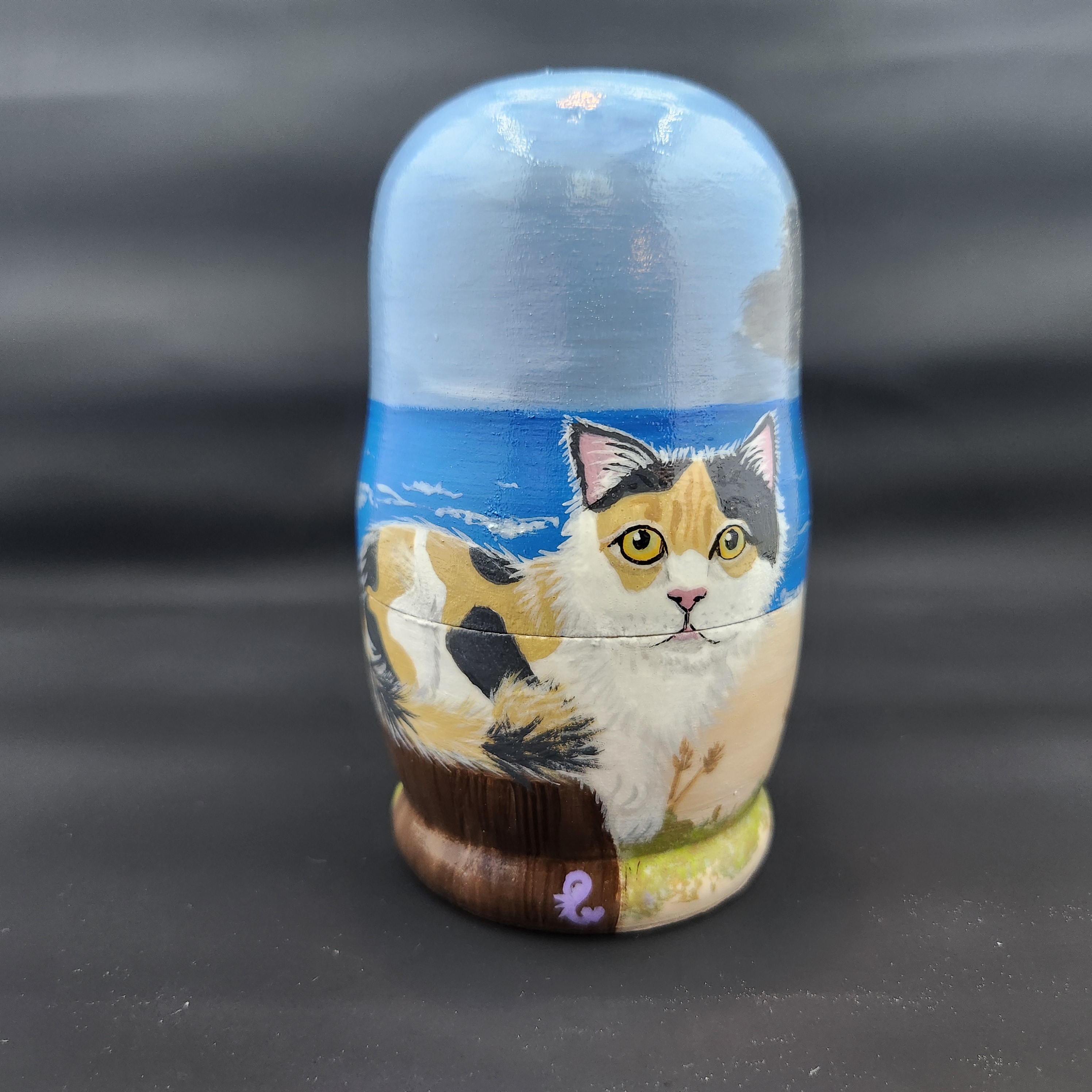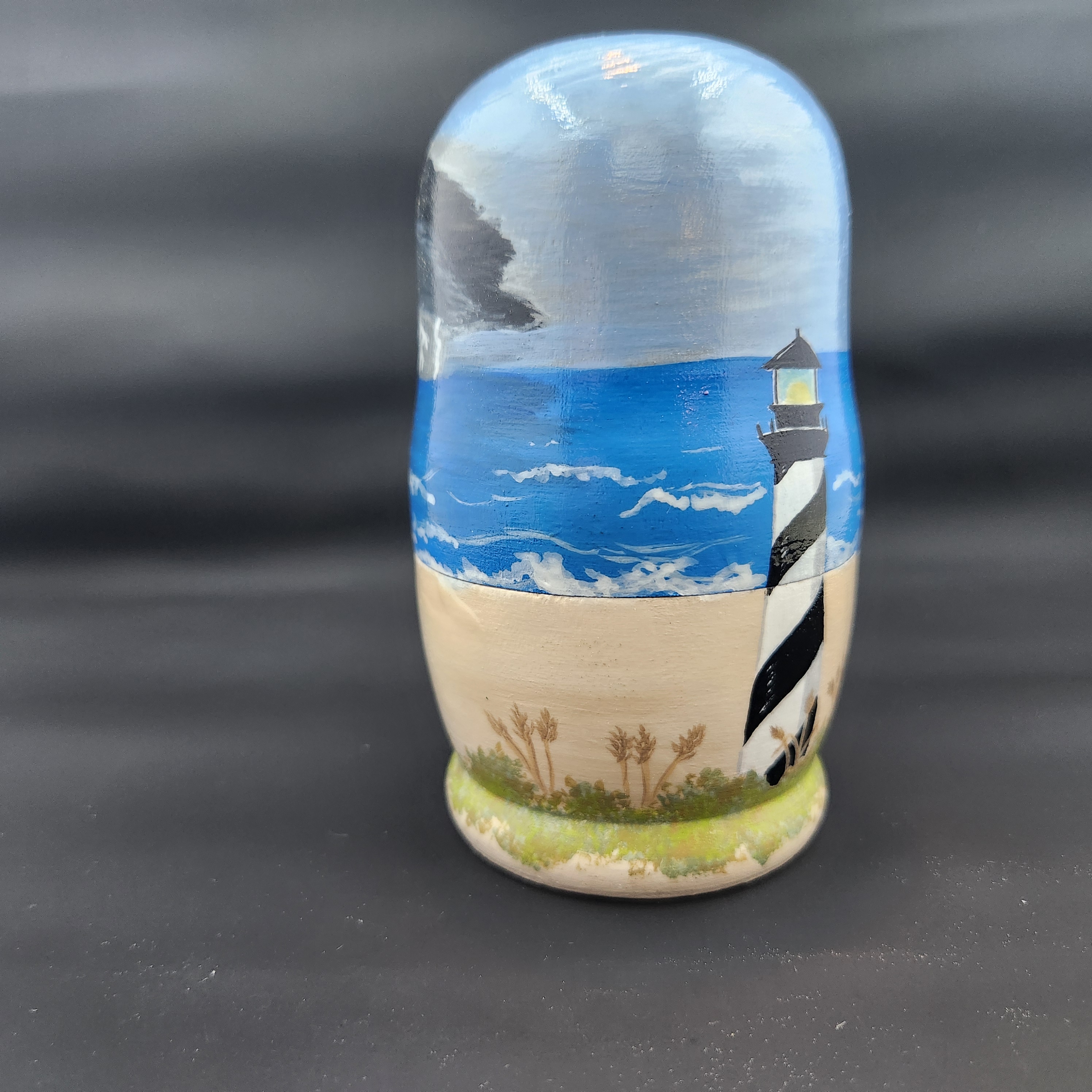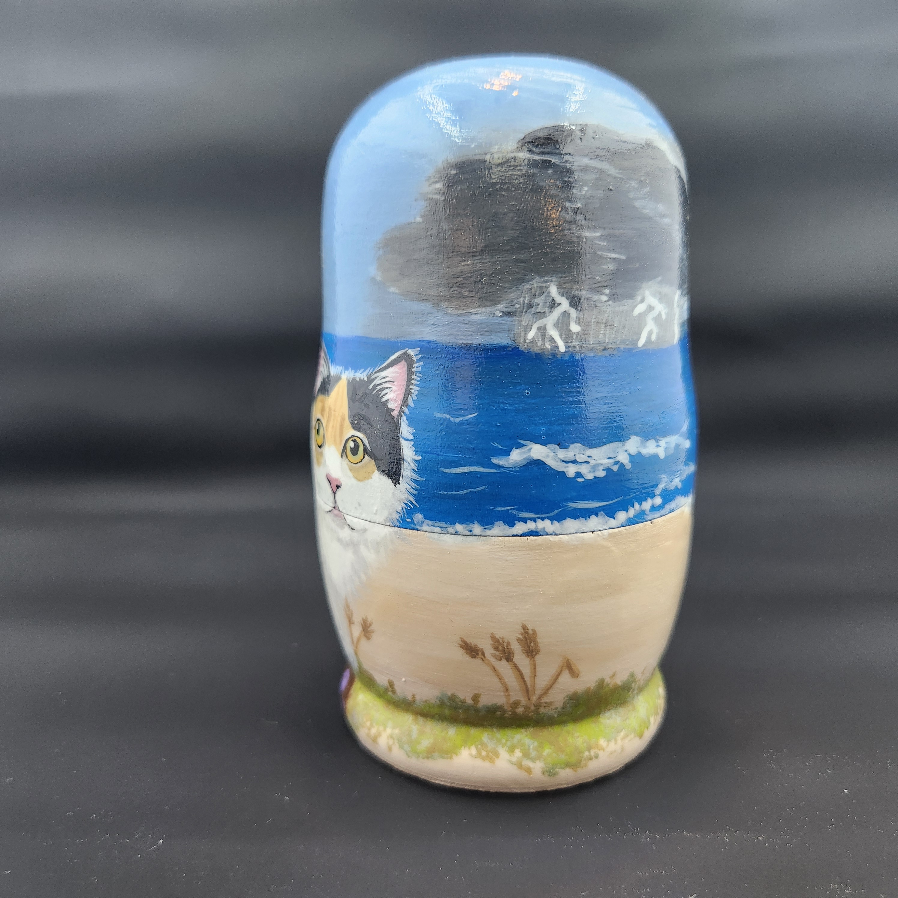 Hand-painted and one of a kind, this nesting doll tells the story of a calico cat who wanders the North Carolina coast, carrying lighthouses, storms, sea creatures, and shoreline treasures within. From Cape Hatteras to glowing tides, each layer opens to reveal a quiet moment of coastal magic—some softly glowing after dark.