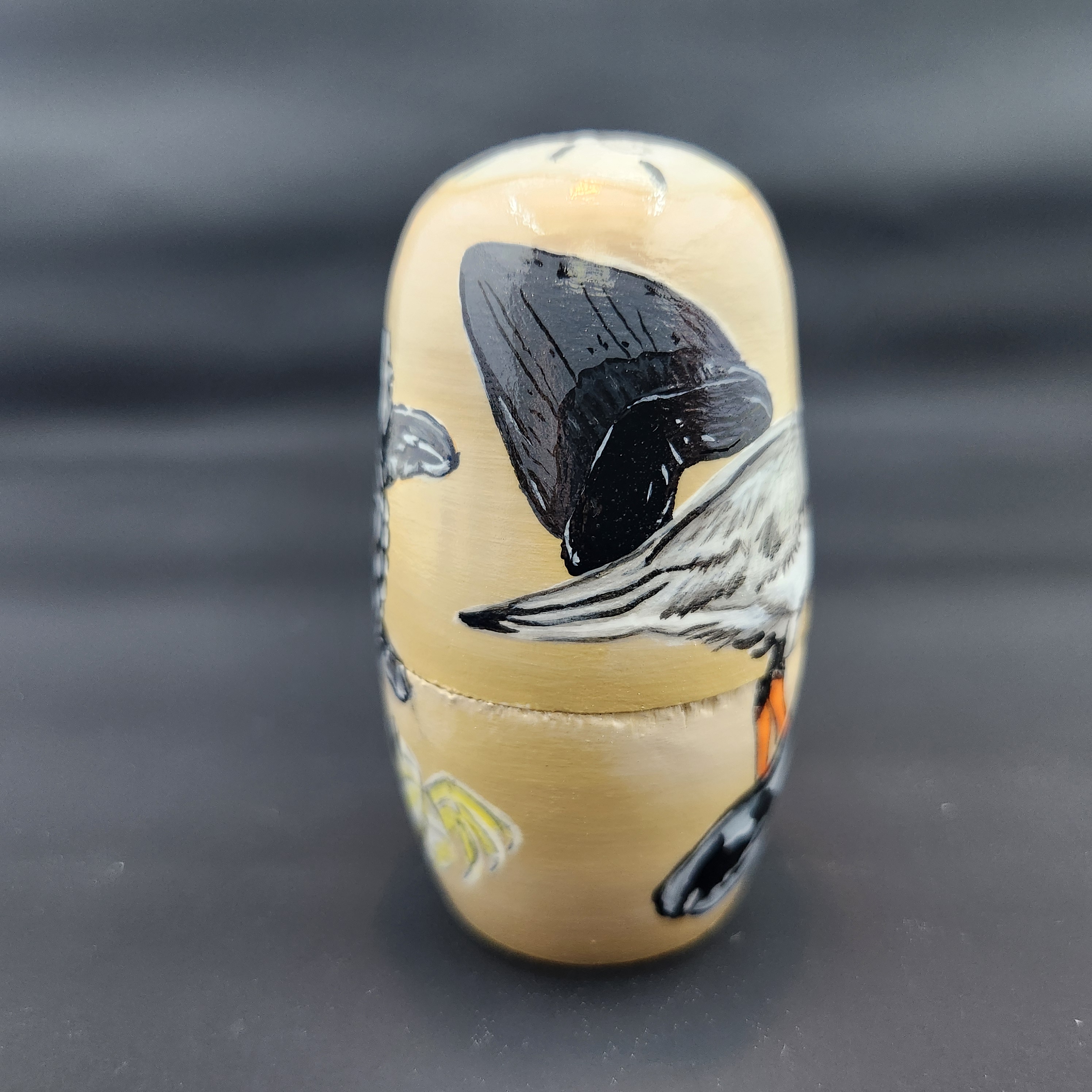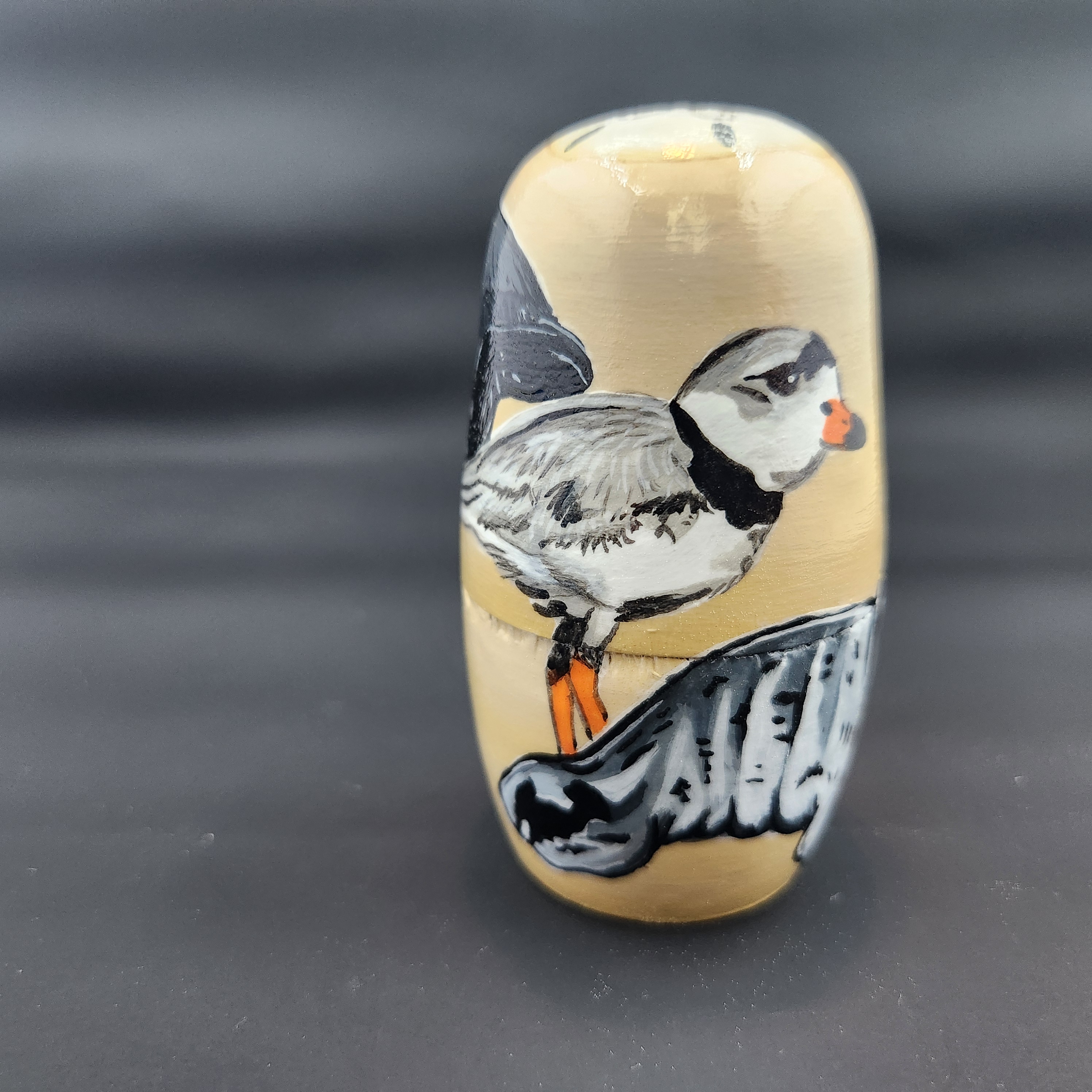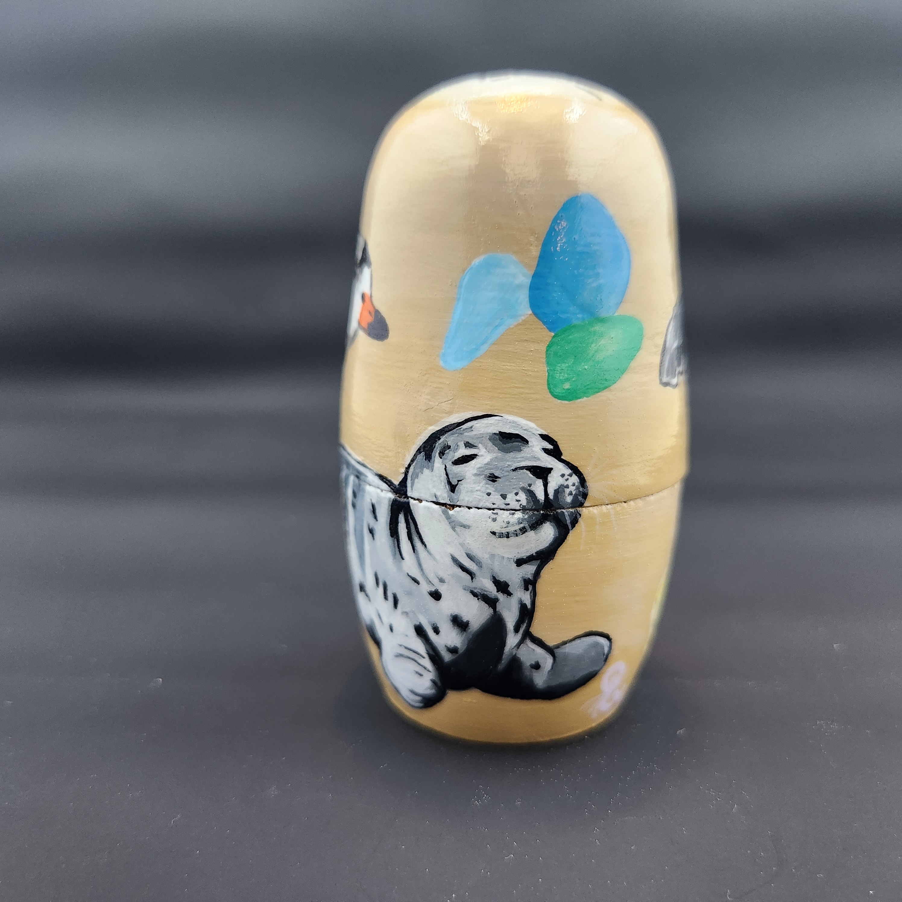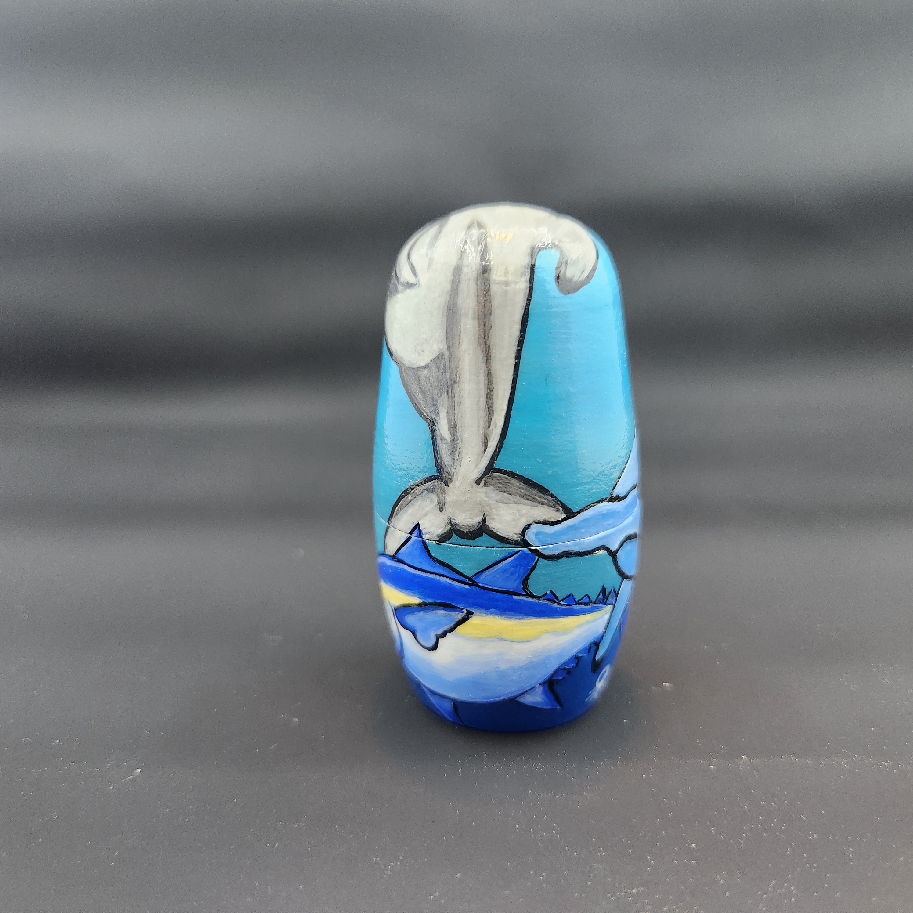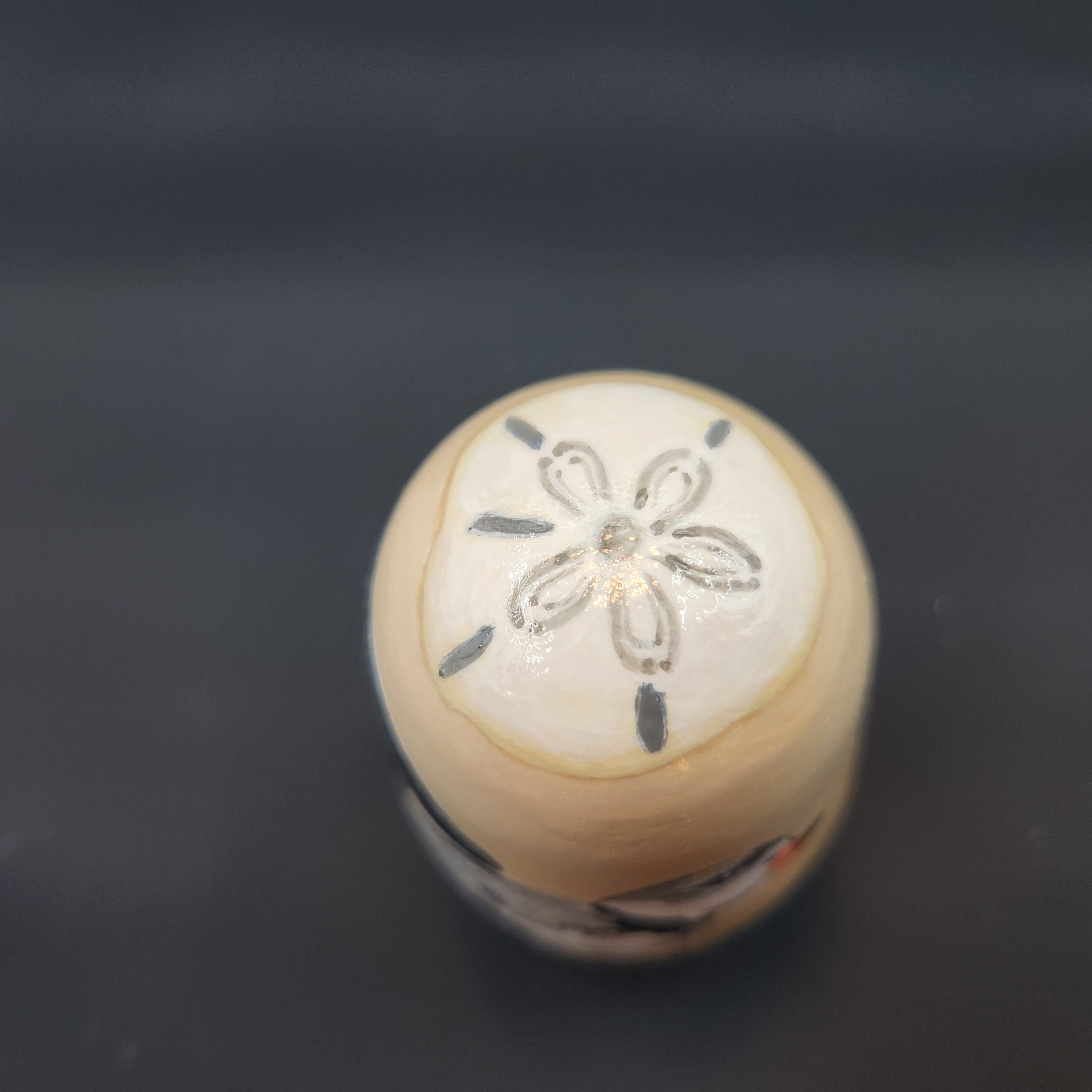 Hand-painted and one of a kind, this nesting doll tells the story of a calico cat who wanders the North Carolina coast, carrying lighthouses, storms, sea creatures, and shoreline treasures within. From Cape Hatteras to glowing tides, each layer opens to reveal a quiet moment of coastal magic—some softly glowing after dark.