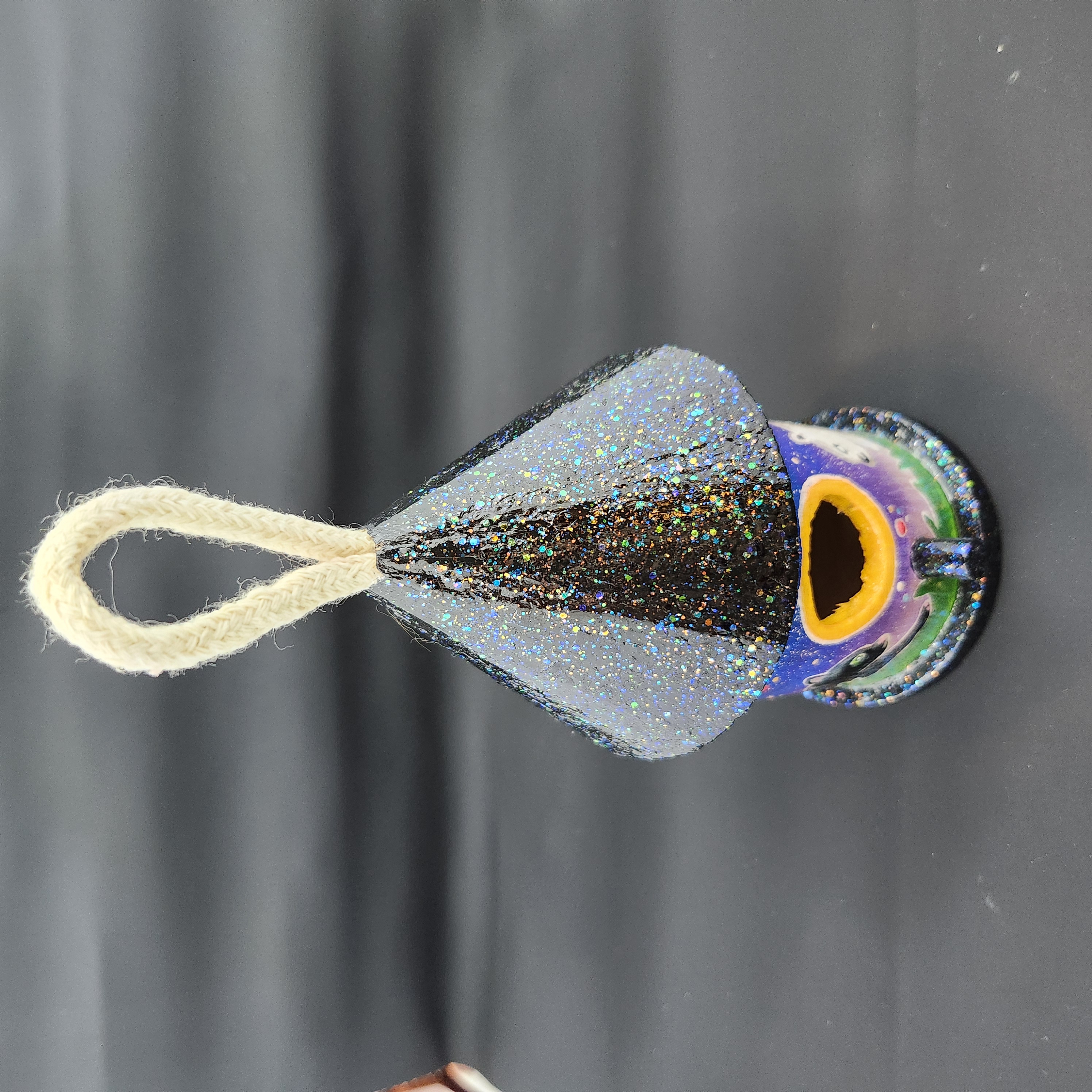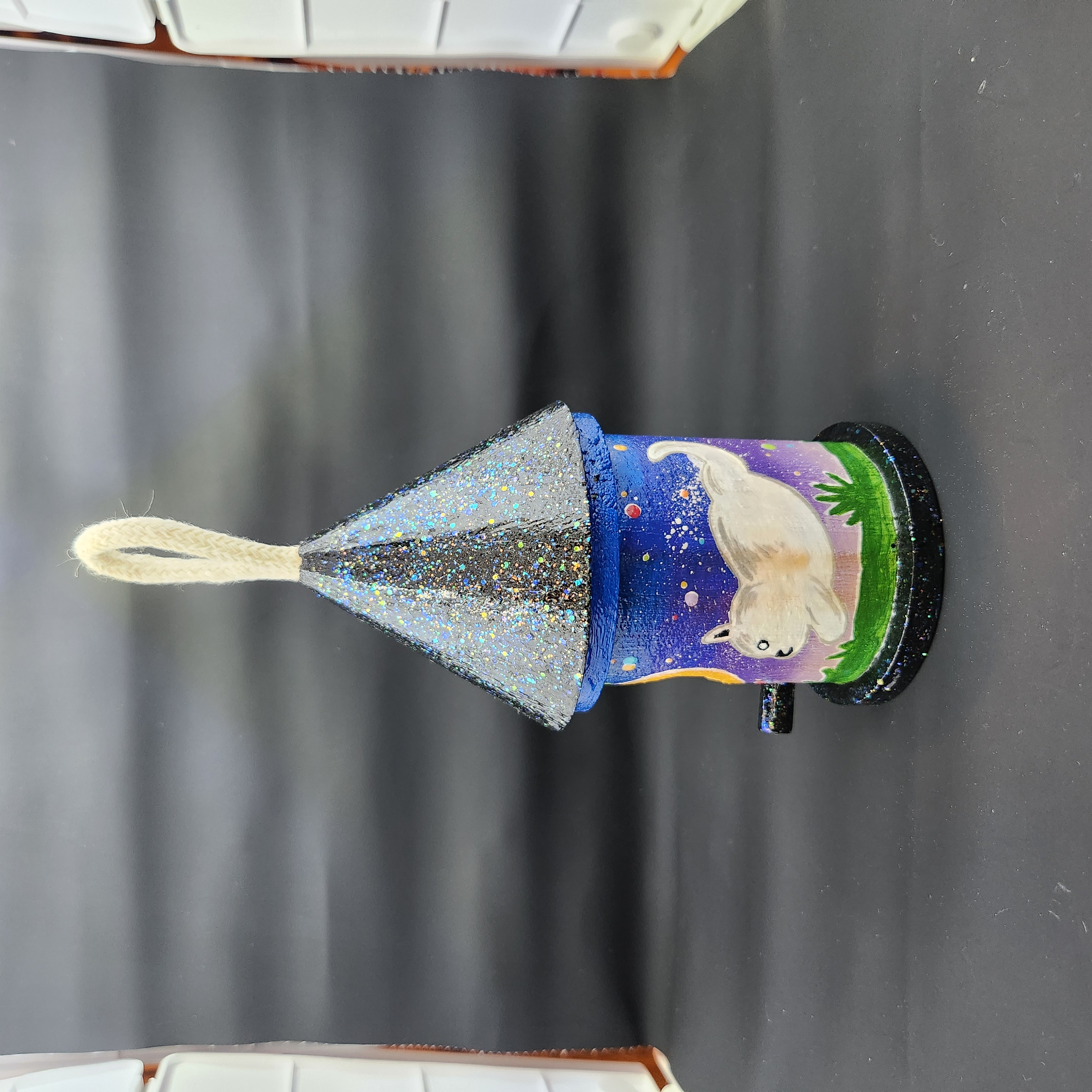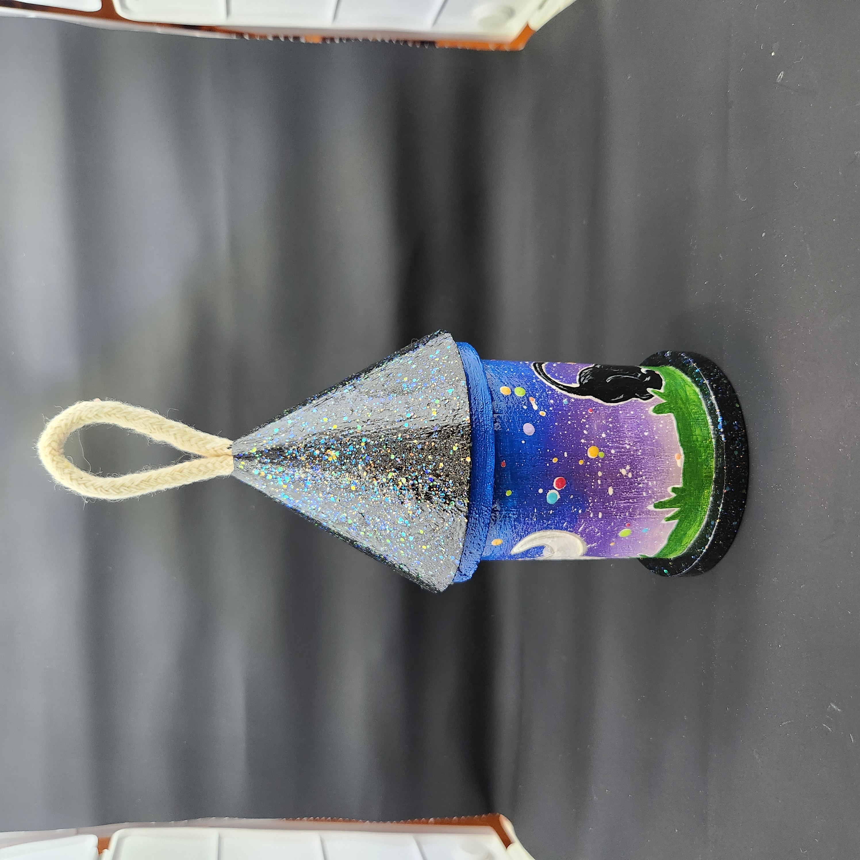 Hand painted and one of a kind, this round birdhouse captures a quiet moment where fur and spirit meet beneath a full moon. A black cat stretches toward the light while its ghostly echo mirrors the gaze, surrounded by drifting magickal orbsβ€”watching, wishing, and keeping gentle vigil.